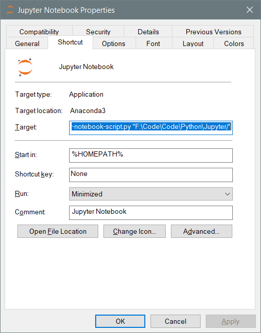 首先找到Jupyter Notebook的快捷方式,右键点击属性,定位到Target栏,将里面的%USERPROFILE%改成你想要的文件夹完整路径,例如我想改到F:\Code\Code\Python\Jupyter,就改成如下图片的样子。重新用修改过的快捷方式打开它,工作文件夹就改变了。