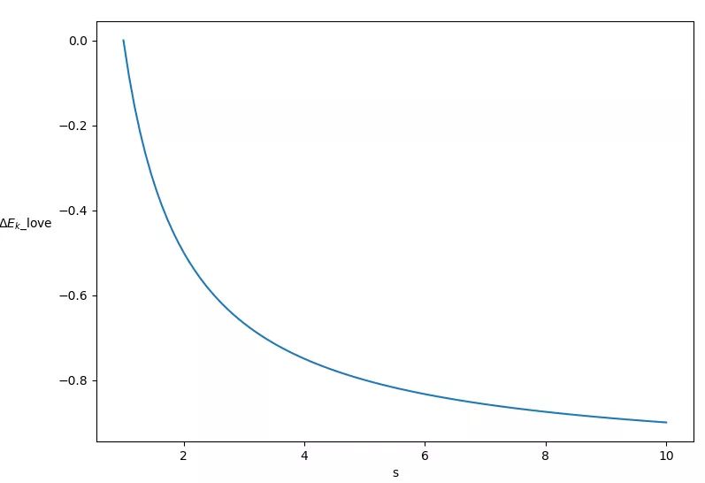 从图像上可以看到,s 越大,爱情动能减少越多,就会导致恋爱进入停滞状态,放缓两个人关系的进展,感情逐渐消磨。最关键的是,恋爱势能如果不及时转化为恋爱动能,就会转化为其他能量,长时间的耗散之下,虽然下一次转化为动能时会令感情升温,但是能转化的总动能却也随之减少了,因为异地的时候消耗了太多能量。