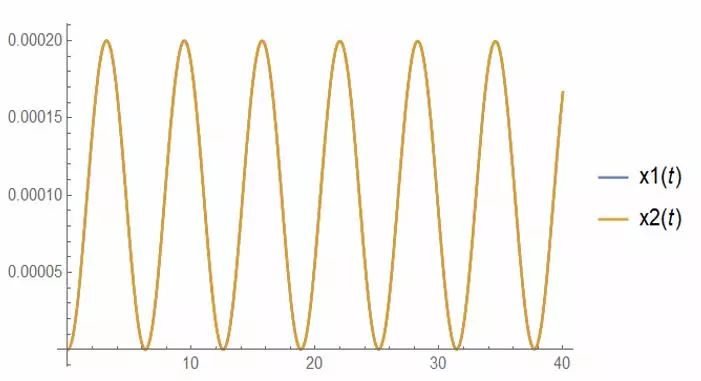 上面我们将模型做了简化,但事实上,$F_{love}$ 在这里是会改变的。此时,两个小球仍然会做振动,不过不再是简谐运动。这种情况下,求解此问题会变得更加复杂,这里我们使用Mathematica 软件给出几组数值解。