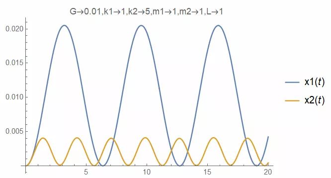 ▲ 另一组用于模拟计算的参数, L = 1,m1 = m2 = 1,k1 = k2 =1,G = 0.01
