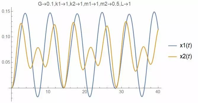 ▲ 用于模拟计算的参数分别为 L = 1,m1 = m2 = 1,$k_1 = k_2 =1,G = 1$